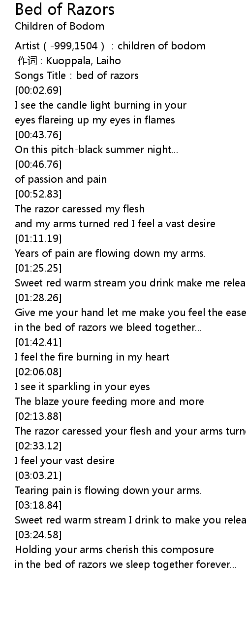 Hatebreeder 1999 4 translations Translations. I feel the fire burning in my heart I see it sparkling in your eyes The blaze youre feeding more and more The razor caressed your flesh and your arms turned red. Bed Of Razors by Children of Bodom song meaning lyric interpretation video and chart position.